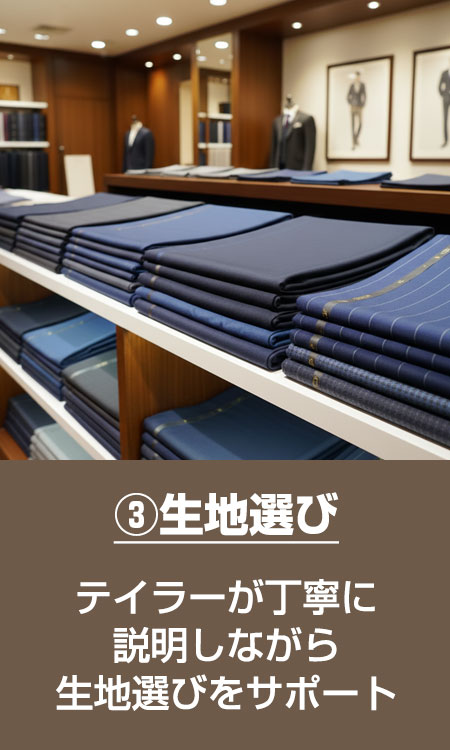 3,000種類以上の生地から時間をかけて1着を作り上げる本格派の老舗。